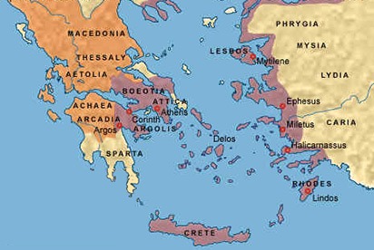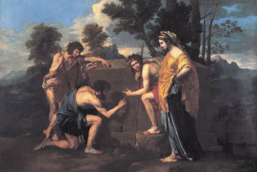 Arcadië is van oorsprong een vallei omringd door beboste bergen op de Pelopponesos in Griekenland. Griekse dichters als Theocritus ontdekten in de 3de eeuw voor Chr. de streek als symbool van landelijke eenvoud en roemden de heerlijkheid van het leven van jagers en herders die hele dagen met hun kudde in de natuur liepen en muziek maakten met hun fluiten. Op het kaartje is links “Arcadia” zichtbaar.