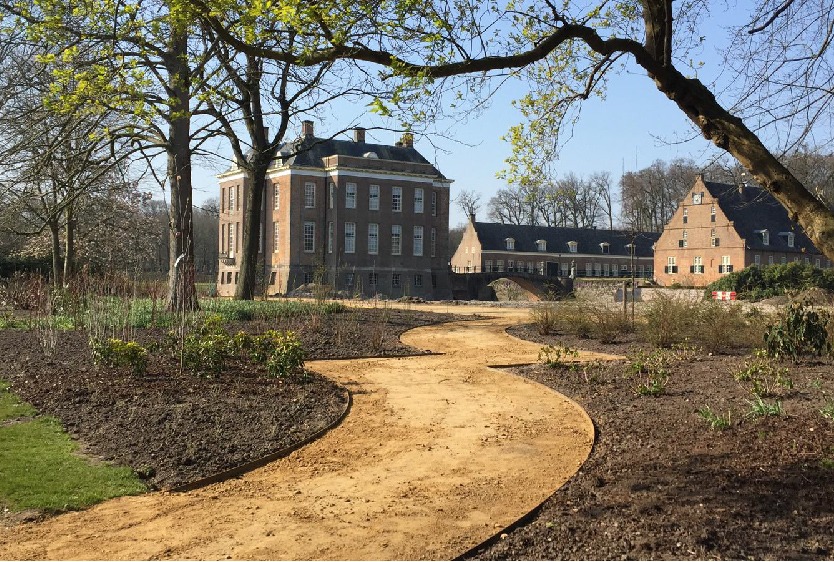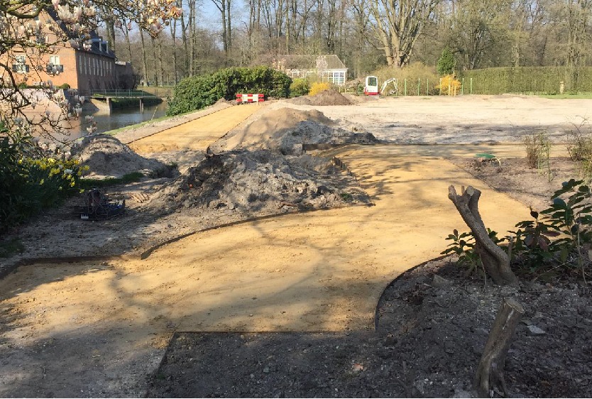 Op 3 februari is begonnen met de restauratie van de Oostparterre op Middachten, en in de afgelopen twee maanden is er veel vooruitgang geboekt! De paden en het terras zijn aangelegd en opgesloten met een stalenband, en ook de beplanting staat er al voor een groot deel in. De authentieke zandstenen ‘wangen’ liggen inmiddels klaar om geplaatst te worden.