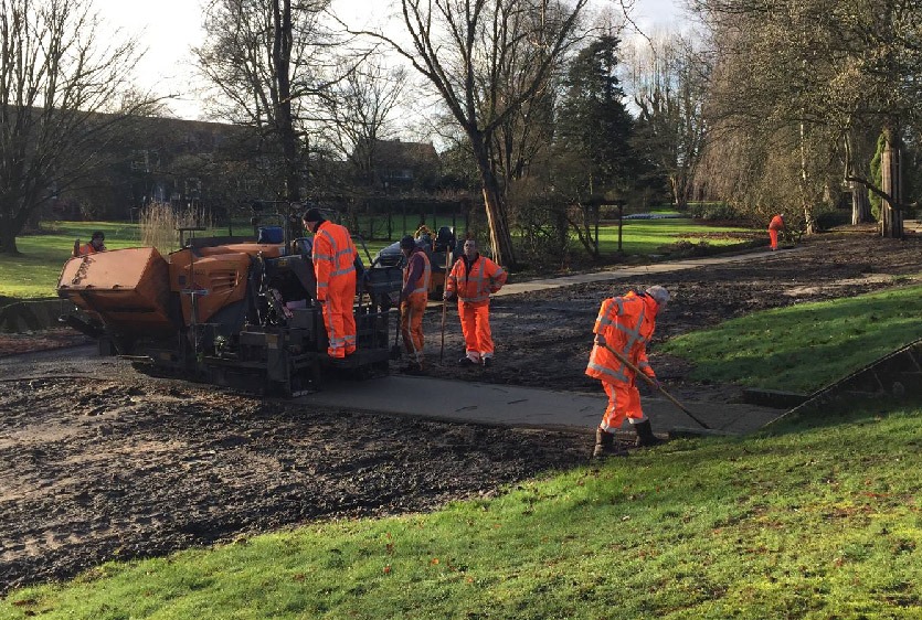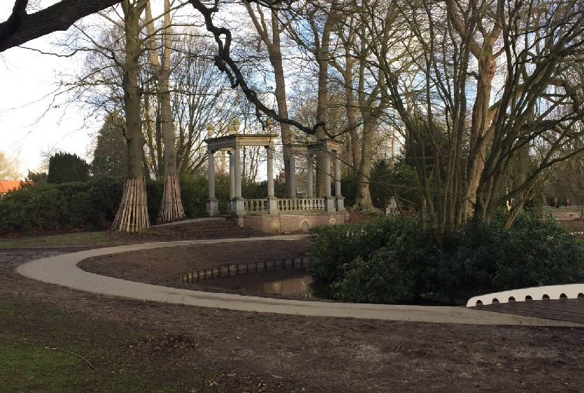 De restauratie van het Cantonspark in Baarn is in volle gang en het resultaat tot zo ver is veelbelovend. Er is veel opslag verwijderd waardoor de vele bijzondere oude bomen en heesters weer goed zichtbaar zijn. De contouren van de gerestaureerde rozenparterre zijn weer zichtbaar. Het padenstelstel is inmiddels ook geheel hersteld. Ontbrekende wandelpaden zijn opnieuw aangelegd aan de hand van de oude kaarten en foto’s die bij het historisch onderzoek zijn geanalyseerd. Alle paden krijgen deze week een nieuwe toplaag, waarmee dit planonderdeel is voltooid. Binnenkort worden de nieuw ontworpen toegangspoorten geplaatst. Het fraai gerestaureerde Cantonspark zal komend voorjaar weer worden geopend voor het publiek.